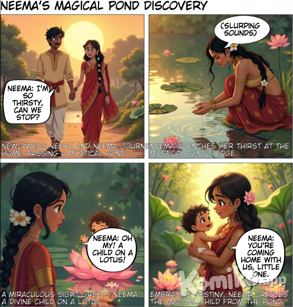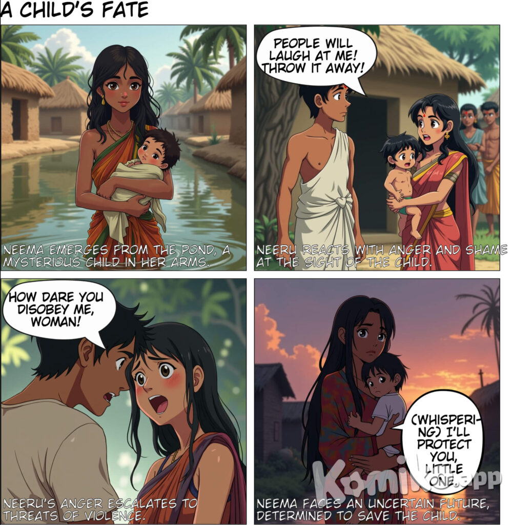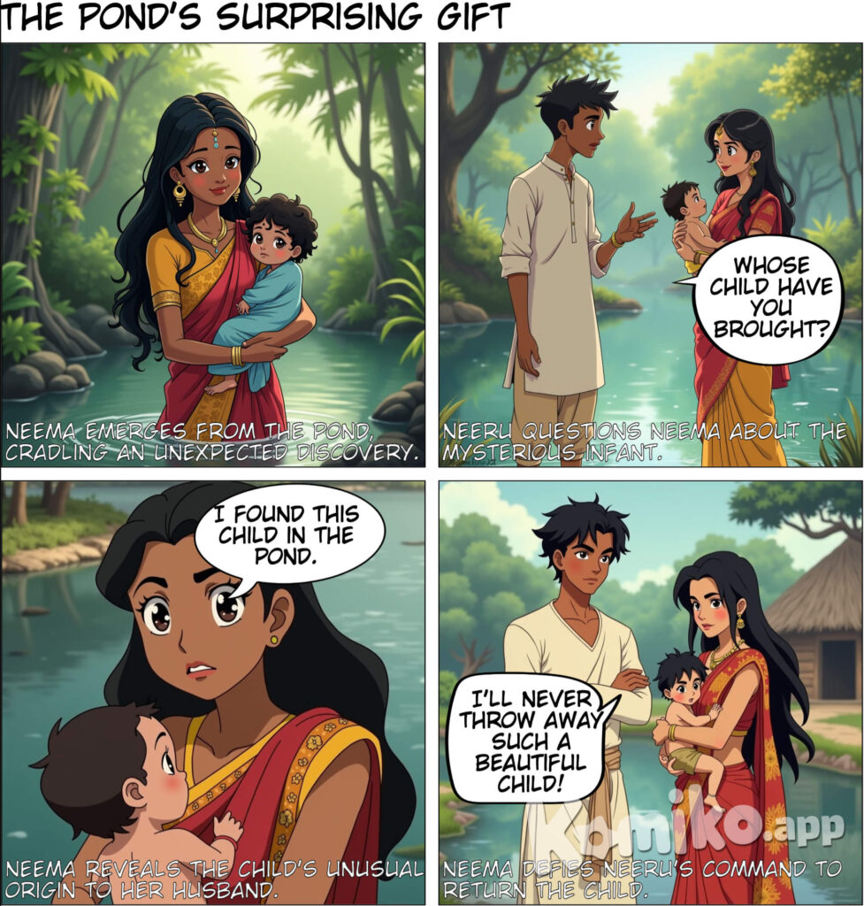 Then the weaver Neeru asked to his wife Neema, whose child has she brought? Then Neema replied that she found it in the pond. Neeru said, keep the child back where you brought it from. I don’t know whose child it is? Then the Neema replied that I will never throw away such a beautiful child.